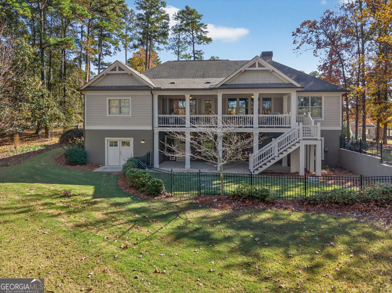 Welcome to exceptional living within The Landing at Reynolds Lake Oconee..a sought-after golf and lake community. This meticulously designed 5-bedroom, 4-bath home offers unparalleled comfort and has access to shared boat slips in Lakeview Terrace. Step inside to an expansive, open-concept floor plan designed for effortless entertaining. The main level is an owner's dream, featuring not one, but two luxurious master suites, along with a convenient third bedroom. The gourmet kitchen flows seamlessly in to the main living which opens to a generous, covered porch overlooking a private, fenced backyard, creating a serene indoor-outdoor oasis. The lower level consist of a great room, second kitchen, game room, and a workout room with two more bedrooms and bath as well as storage areas and bonus room.