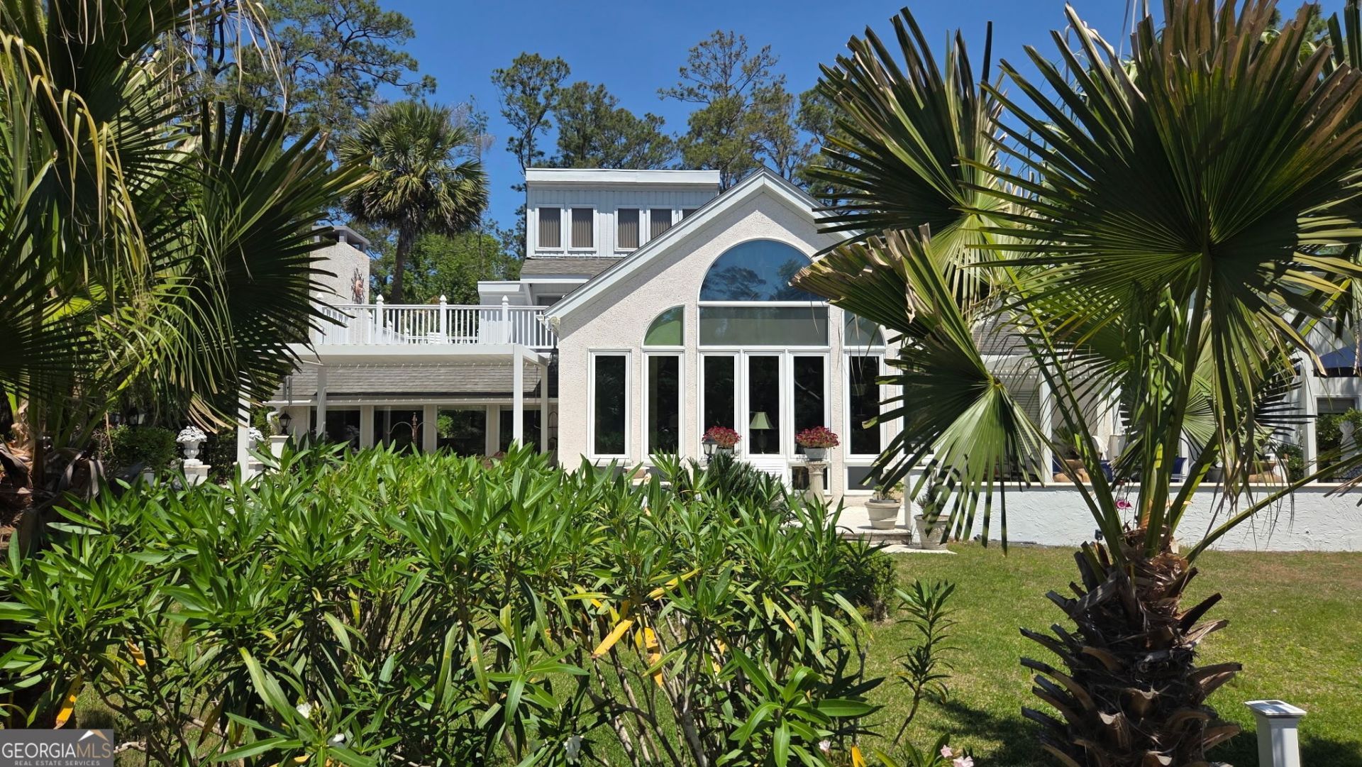 Elegant custom built home in the sought after Sea Palms golf community. This island classic contemporary features high vaulted ceilings in the sunroom and great room. Panoramic floor to ceiling south facing windows provide lots of sunlight and nature views. Open concept kitchen, great room, and sunroom with travertine flooring. Step down family room with vaulted tongue & groove stained ceiling, exposed beams and a brick fireplace. The stunning kitchen has a gorgeous cooktop island, granite countertops, stainless appliances, and double pantries. This home features two en-suites plus an additional guest bedroom with adjacent bath. The primary bedroom has a vaulted ceiling, private balcony and a his/her layout with separate dressing area and separate vanities and a skylight. This large, private lot is beautifully landscaped with topical plants and has room for a pool. AI generated pool in photos
