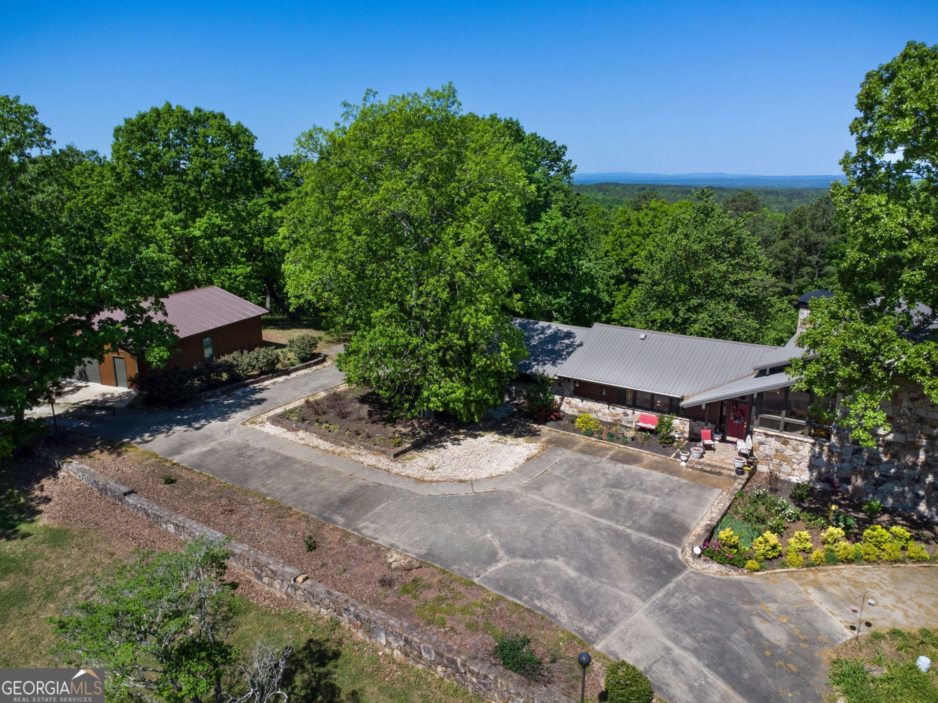 Step into something truly special with this custom-built home, now offered below its recent $750,000 appraisal-creating a rare chance to walk into immediate value. Situated on 10 quiet, history-rich acres where buffalo once roamed, this property delivers the kind of peaceful, outdoor-focused lifestyle that's hard to replicate. Positioned along a ridge at 1,500 feet, the home showcases breathtaking, unobstructed views of Cheaha Mountain and the surrounding landscape. From vibrant sunrises to golden sunsets and frequent wildlife sightings, the setting alone makes this property unforgettable. Constructed with hand-selected stone from the Tennessee Smoky Mountains, the exterior sets the tone for the craftsmanship carried throughout. Inside, you'll find a warm and welcoming interior highlighted by hardwood flooring, large windows that frame the views, and unique custom finishes-including detailed stair railings. The main living area features a dramatic stone fireplace, while a secondary living space offers a cozy wood-burning German stove for added character. The kitchen blends style and function with granite countertops, custom cabinetry, and a striking live-edge breakfast bar that overlooks the natural surroundings. Upstairs, the primary suite offers a private escape with its own deck and stunning views, along with an additional bedroom and full bath. The lower level expands your living space with a third bedroom, full bath, and a den complete with a wet bar-ideal for entertaining or hosting overnight guests. Additional features include an attached two-car garage with a utility bath and shower, as well as a 30x40 detached garage built in 2023 with power and double insulation. Whether used for storage, hobbies, or converted into a barndominium, the possibilities are there. Located in the desirable Bowdon High School district and just a short drive to I-20, this property offers the perfect balance of privacy and convenience. With incredible views, quality construction, and room to breathe, this is a home that truly stands apart.