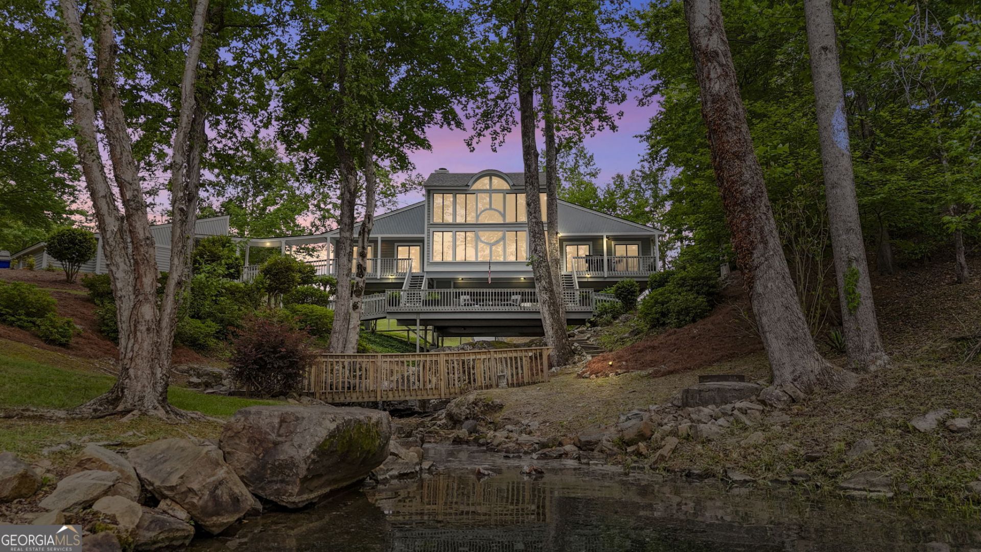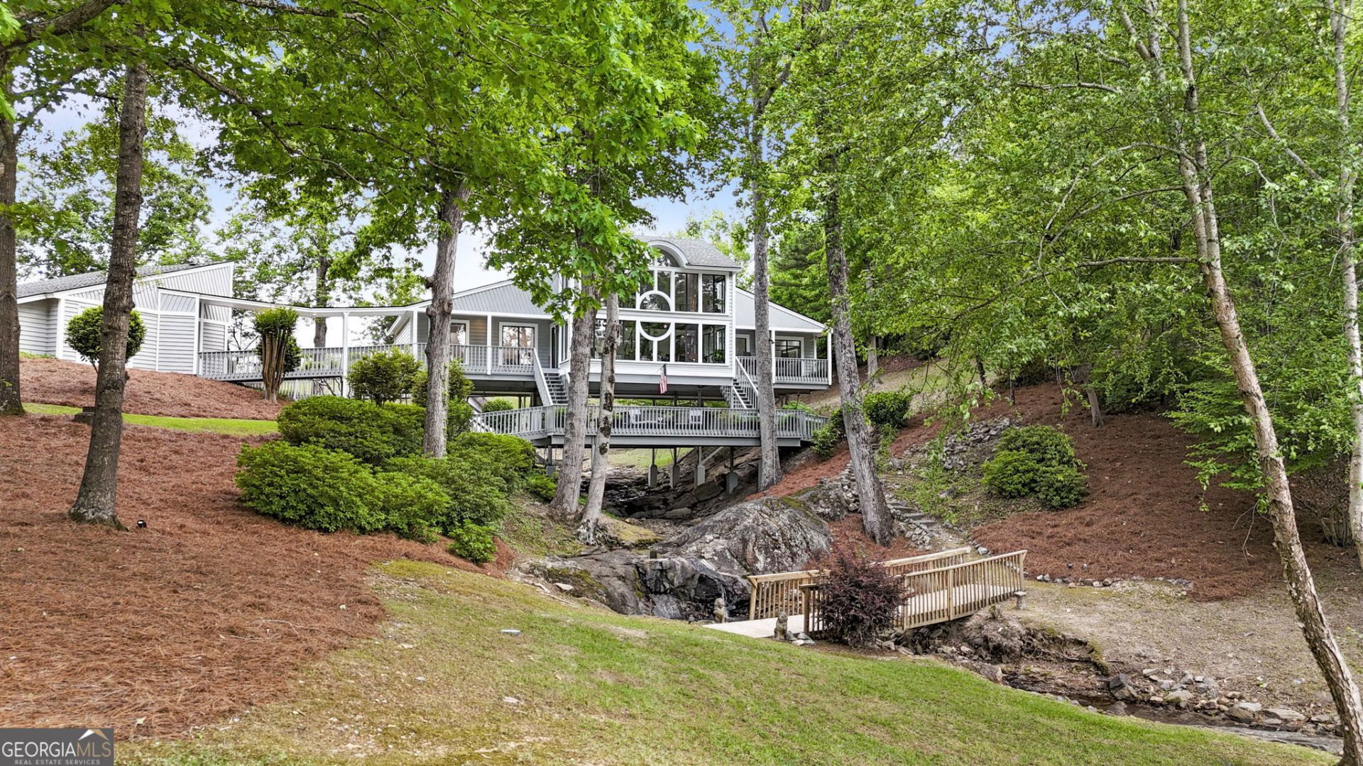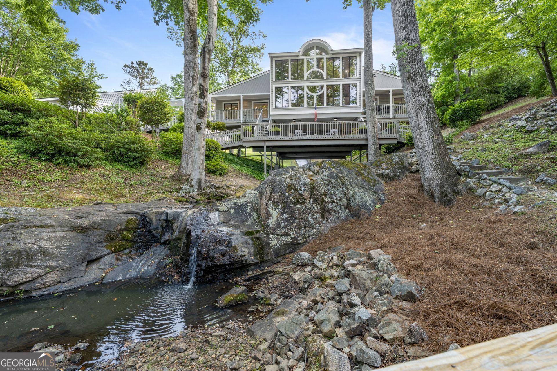 Experience the Extraordinary in this one-of-a-kind custom masterpiece, uniquely engineered to sit directly over a cascading natural waterfall and situated on a lush, 1.03-acre wooded lot. This retreat has been meticulously remodeled by the current owners with high-end finishes and organic tones designed to complement the breathtaking scenery of Lake Tobesofkee. The two private bridges that lead you from the parking area to an entrance feels like a world apart. A seamless split floor plan features a main-level primary suite with lake views and an electric fireplace, and the two guest rooms separate from the primary, each also have their own lake front view. In the center of the home you'll find a striking floating staircase to enhance the open lake view that ascends to a versatile loft, perfect for a home office or secondary lounge. In the kitchen you'll find Italian Bertazonni appliances, 6 burner gas stove, Bianco Superiore Quartzite countertops, soft-close cabinets, and walk in pantry with wine cooler and wood shelving. Every update was chosen to highlight the natural light and serene views of the surrounding canopy and water. The primary suite bath was completely reimagined with wet area walk in shower with 65 Lapopie solid surface tub, 72 freestanding double vanity that gives you the sensation of being in a spa. Beneath the home, you'll find the party deck, this expansive entertaining space features two dedicated viewing areas to enjoy the falls flowing directly under the structure and overlooking the third bridge on the property that leads you to the boat dock where you can watch the sunset or the fireworks on the 4th of July. This isn't just a home; it is a living work of art. Opportunities to own a property where architectural ingenuity meets the tranquil power of nature are truly once-in-a-lifetime. Schedule your private tour to witness the most unique listing in Middle Georgia