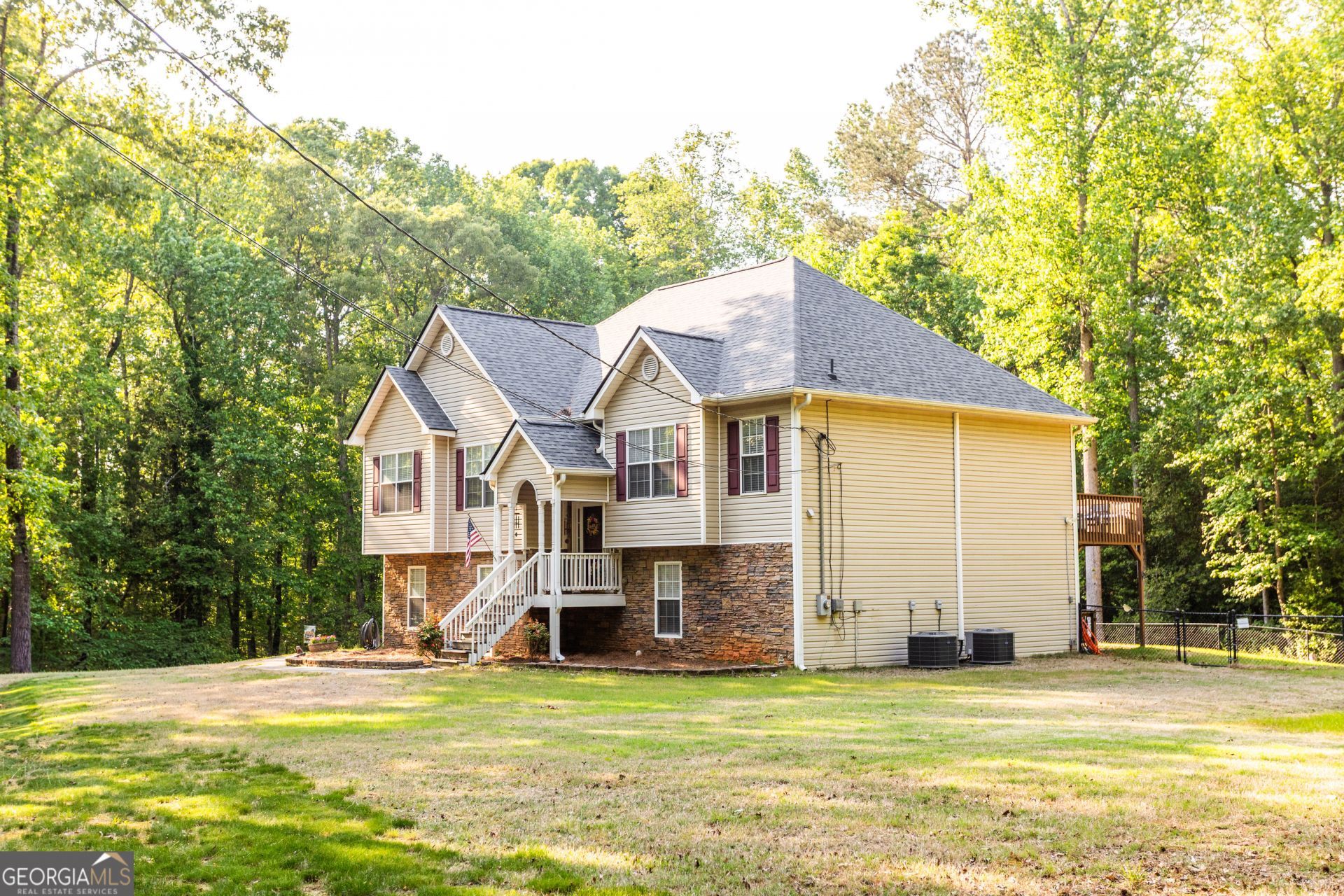 Tucked away on a private 1.43-acre wooded lot, this well-maintained 4-bedroom, 3-bath split-level home offers space, flexibility, and convenience with no HOA. The exterior features attractive stacked stone and low-maintenance vinyl siding for lasting curb appeal. Inside, the main level boasts high ceilings and abundant natural light, creating an open and inviting atmosphere. The lower level includes a kitchenette, private entrance, and patio-ideal for a teen or in-law suite. Enjoy outdoor living with a sundeck overlooking the fenced backyard, plus an outbuilding for additional storage. Conveniently located just minutes from Covington, Conyers and I-20, this property combines peaceful surroundings with everyday accessibility.