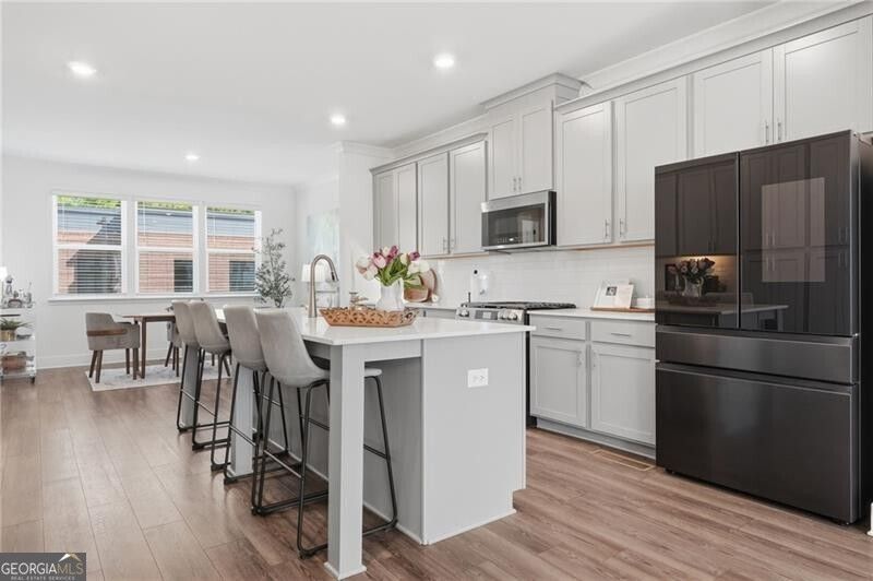 Newer construction meets thoughtful design, offering a low-maintenance lifestyle in a prime Peachtree Corners location. Step inside to a welcoming foyer that leads to a private bedroom and full bathroom on the main level - perfect for guests, a home office, or flexible living needs. The second level opens to an expansive, light-filled, open-concept living space where the kitchen, dining, and family room seamlessly connect. Designed for both everyday living and entertaining, the kitchen features modern cabinetry, updated finishes, and a large island overlooking the main living area. Just off the family room, a private deck offers the perfect setting to relax, unwind, or enjoy outdoor gatherings. Upstairs, convenience continues with a centrally located laundry room and two spacious primary suites, each offering well-appointed bathrooms and generous closet space providing both comfort and versatility. Enjoy peace of mind with newer systems and HOA-covered exterior maintenance, including the roof and grounds, allowing for truly low-maintenance living. A two-car garage adds convenience and additional storage, with ample guest parking available throughout the community. As an added lifestyle benefit, residents have the option to access the amenities at Broadstone Peachtree Corners for an annual fee. Enjoy beautifully landscaped courtyards with a fire pit and inviting gathering spaces, a club room featuring an entertainment kitchen and pool table, a resort-style saltwater pool, and a fully equipped fitness center. Additional highlights include an elevated garden terrace with pool views, a game lounge with an indoor golf simulator and putting green, secure bike storage, and EV charging stations, bringing together comfort, convenience, and lifestyle. Located just minutes from Peachtree Corners Town Center, The Forum, dining, shopping, and major highways, this home offers the perfect blend of modern living and everyday convenience.