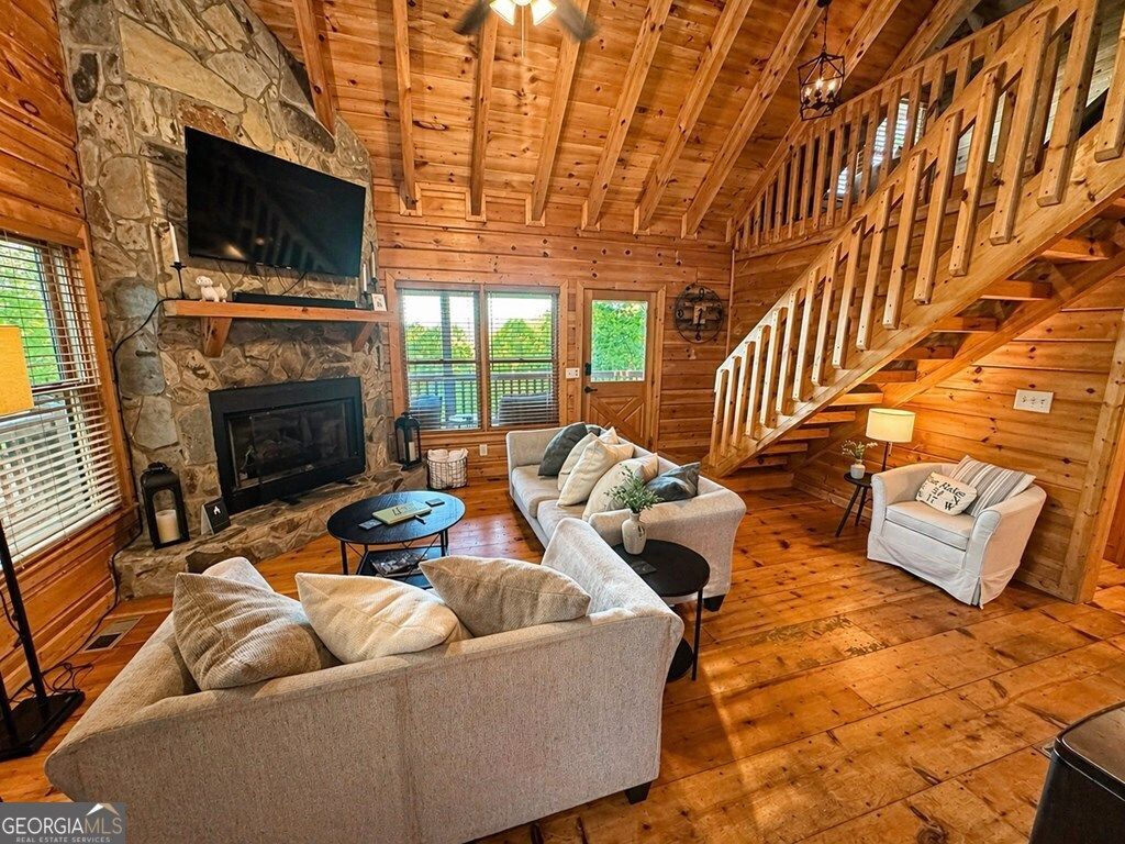 ^Modern Mountain Cabin Living^ This 3BR, 2BA d-style real log cabin is nestled privately w/ end of the road privacy in cul-de-sac on 1.71 beautiful wooded mountain acres. You'll be amazed at the gorgeous panoramic long range mountain views as your backdrop to this picture perfect postcard setting. Interior of cabin offers lots of windows & natural light, soaring cathedral ceilings w/ exposed beams, fixed glass windows, lots of windows & natural light, wood floors throughout, tongue & groove interior, & custom cabinetry w/ upgraded stainless steel appliances. This spacious open floor plan features 2BR's on the main level w/ large loft BR above offering a sitting area overlooking this enchanting view that you could wake up to each morning. Each level offers a full bathroom. As you approach the home, you'll feel that sense of mountain compound you will notice attention to detail - great fenced in yard area great for kids or your furry kids, metal roof, lots of parking w/ turn around & well maintained. Large, covered porch spans entire length of home w/ wrap around deck + private hot tub porch & additional outdoor living space on ground level featuring stone fire pit - the perfect place to relax & unwind. Conveniently located between Blue Ridge & Ellijay making it the perfect location in popular Cherry Lake w/ access to numerous privately stocked community lakes great for fishing & kayaking + direct access to the Benton MacKaye Hiking Trail which runs through the community. This one can be purchased turn-key fully furnished separately via a Personal Property Bill of Sale - prime STR/investment property!!! This one has rental history available.