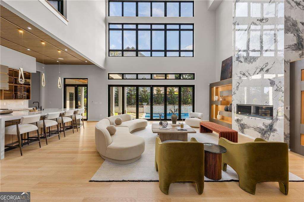 A modern masterpiece of distinction, 4232 Edgewood Court is nestled on a rare 0.75-acre corner lot-one of the largest within the prestigious Indian Hills Country Club-and located in the highly sought-after Walton High School district. Offering six bedrooms, seven full baths, two half baths, and approximately 9,200 square feet across three levels, this newly completed residence pairs sculptural architecture with a full suite of resort-style amenities. From its commanding curb appeal and manicured grounds to sleek casement windows with wood-look panels and curated architectural lighting, every detail reflects thoughtful design and modern luxury. Beyond the grand pivot door, soaring ceilings frame a dramatic foyer and family room where a floating steel staircase with motion-sensor lighting becomes the architectural centerpiece. Premium chandeliers, bespoke built-ins, and a striking fireplace set an atmosphere of elegance and sophistication. The state-of-the-art kitchen blends performance and artistry with custom cabinetry, quartzite waterfall countertops, acoustic wood panels, and commercial-grade appliances. A concealed scullery ensures effortless entertaining, while sleek nano accordion doors expand the living space seamlessly to the outdoors. The main-level primary suite serves as a private retreat, complete with bespoke closets and a lavish spa bath featuring a sculptural stone soaking tub, dual vanities, and designer finishes. Upstairs, the secondary suites are equally impressive, each generously scaled with private en- suite baths. For convenience, two laundry rooms with custom cabinetry are located on both the main and upper levels. Everyday ease is further enhanced by a three-stop elevator and an expansive four-car garage. The finished terrace level lives like a private club, showcasing a temperature-controlled wine cellar, media lounge, state-of-the-art glass-enclosed gym, fully equipped sauna, powder room, and a beautifully appointed guest suite that opens to a tranquil courtyard. Outdoors, the home transforms into a private resort. A saltwater pool with integrated spa and dramatic waterfall feature anchors the backyard, complemented by a cabana, fire pit, and lush green lawns. The setting is both intimate and expansive, designed for gathering, relaxation, and year-round enjoyment. Indian Hills Country Club offers a lifestyle as remarkable as the home itself, with a 27-hole golf course, newly renovated clubhouse, eight tennis courts, and three pools-all moments from shopping, dining, parks, and both public and private schools. A rare convergence of modern architecture, curated amenities, and resort-style living-4232 Edgewood Court is more than a home, it is a private retreat in one of East Cobb's most prestigious enclaves.