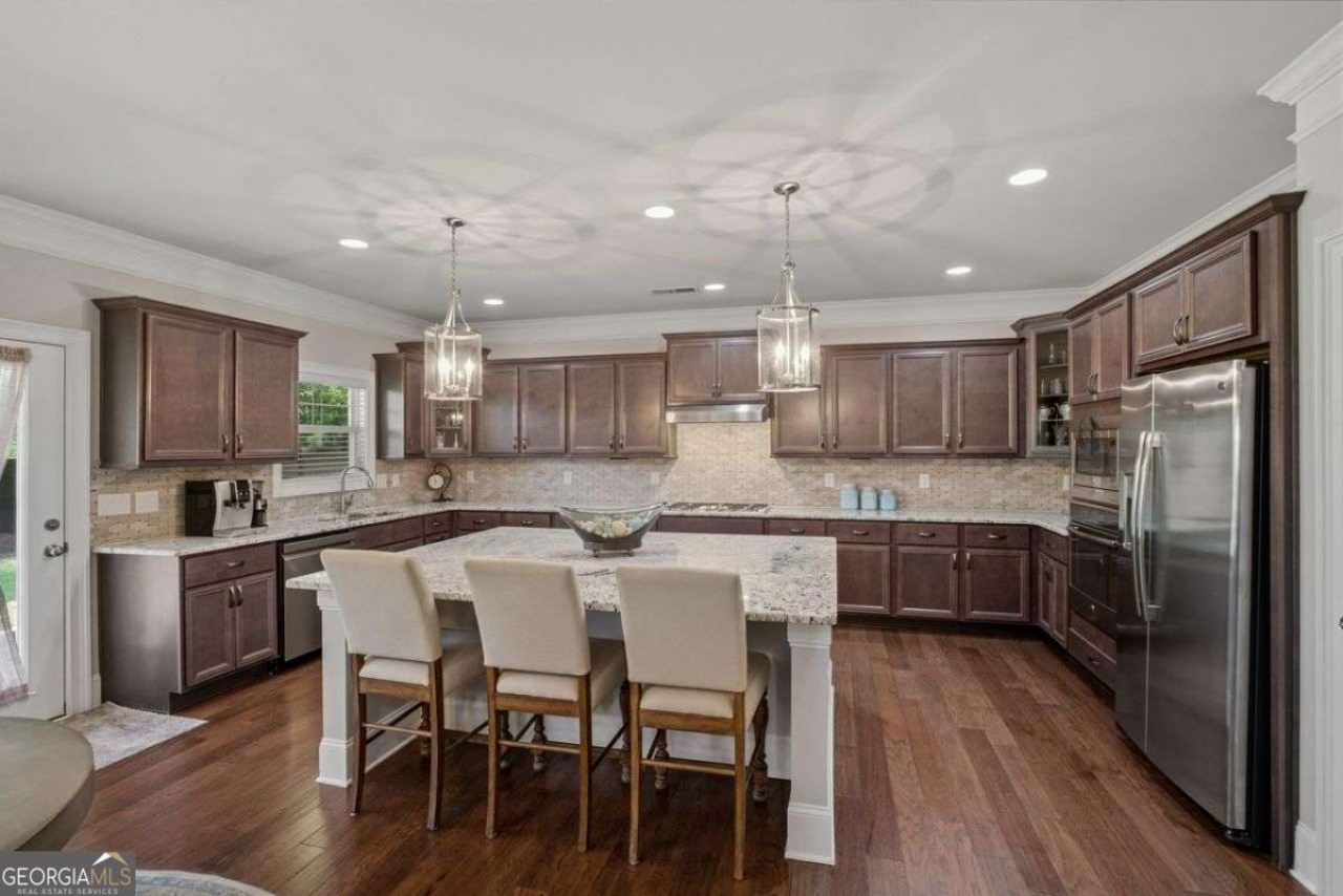 This home was the Builder's model home, and features an amazing DREAM kitchen with a HUGE island!! Gorgeous 5 bedroom, 4 Bathroom home in the gated Warrenton subdivision. The exterior and landscaping are pristinely maintained, and the property is level with a fenced backyard with a beautiful lawn that has plenty of space for a pool if desired! The front yard is inviting and the covered front porch welcomes guests to sit and stay a while. Every part of this home was intentionally set up with upgrades throughout. Hand-scraped hardwood flooring is on the main level. As you walk into the foyer, you'll notice the custom ceiling in the separate dining room, and the flex room/office/exercise room. The family room is spacious and features beamed ceilings, and a gas fireplace with a raised brick hearth. The massive gourmet kitchen island overlooks the breakfast area and living room, which makes entertaining a breeze. For those who like to cook, the massive island is perfect for preparing meals, baking and serving up family dinners! Beautiful custom cabinetry, granite countertops, tile backsplash, under-cabinet lighting and stainless steel appliances are some of what make this kitchen so special! The main floor bedroom connects to a full bathroom, perfect for guests. Upstairs, the massive media room/loft creates bonus space which can be used in many different ways. The oversized Primary bedroom has space for a sitting room, and the vaulted ceiling adds to the charm. The spa-like Primary Bathroom has plenty of space, as does the His/Hers Closet area! The three additional bedrooms upstairs are spacious with large closets! One guest room features an attached ensuite bathroom, while the other two guest bedrooms share a nice hall bathroom. Laundry room has plenty of storage, and is upstairs as well, close to all of the bedrooms. Enjoy the covered patio and private, fenced backyard year round, it is beautiful and peaceful! Small, quiet gated neighborhood in the heart of Sugar Hill has such a great location! Warrenton neighborhood features a playground and picnic area for homeowners to enjoy. Close to downtown Sugar Hill with restaurants, festivals, and the Bowl! Home is immaculate and in excellent condition, don't miss this wonderful opportunity!