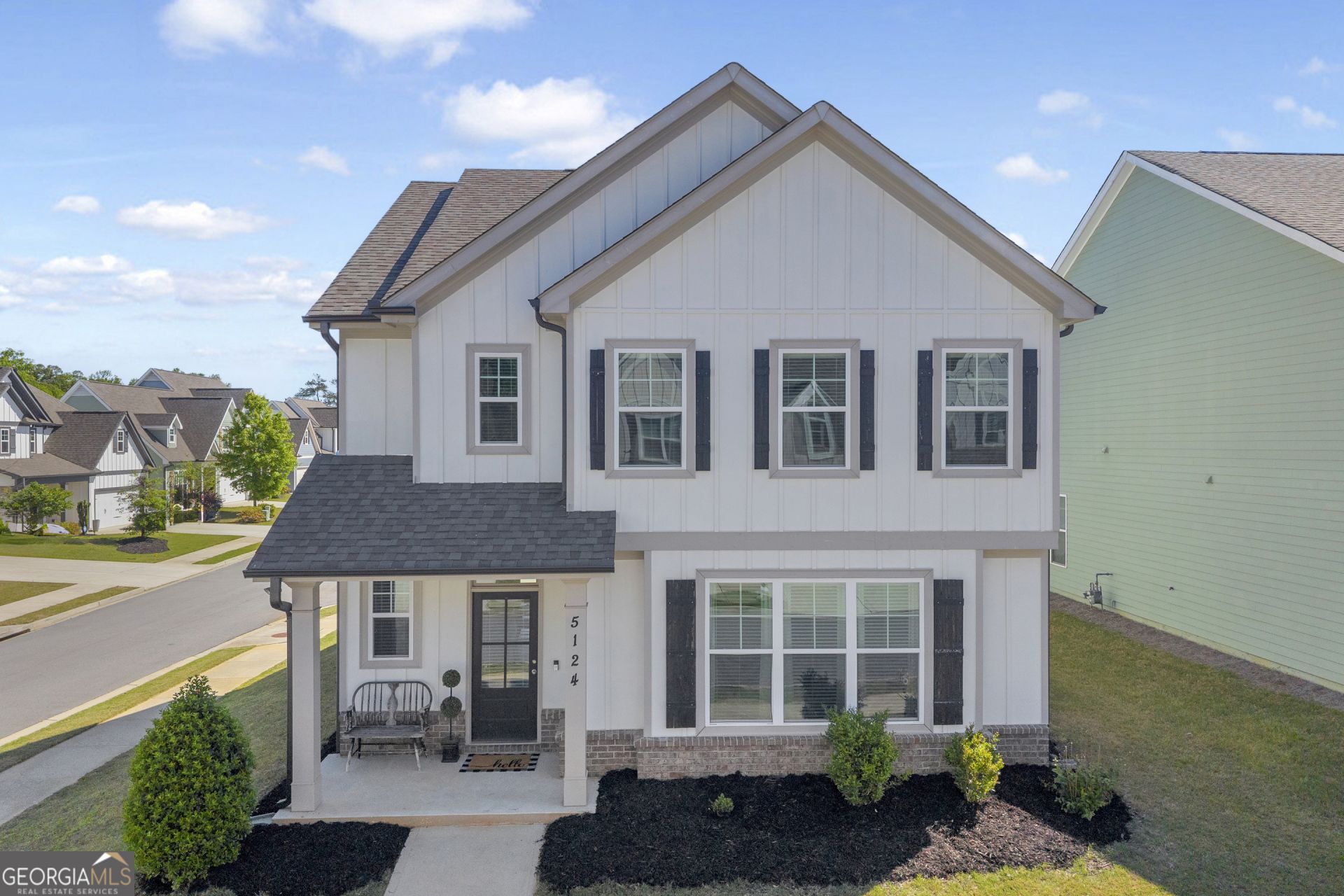 In the heart of Flowery Branch and truly move-in ready. This home is ready for its new owner! Beautiful board and batten siding, a covered front porch, and situated on a desirable corner lot, this home offers extra privacy with an abundance of natural light throughout through the two walls of windows. Inside, you'll love the spacious entryway and open-concept floor plan designed for both everyday living and entertaining. The chef's kitchen features a large island, large white farmhouse sink, gas stove, brand new dishwasher just installed last month, pull-out trash cabinet for two, walk-in pantry, stainless steel appliances and tons of counter and cabinet space. Rear-entry garage, an oversized covered back patio that creates a second entry to the home to the mudroom and half bath. Oversized primary suite upstairs, with two other guest rooms across the hall. The primary bathroom features dual vanities, a large soaking tub, walk-in tiled shower, tiled floors, toilet room and a large walk-in closet. Laundry is conveniently located upstairs as well. Fresh paint throughout, updated kitchen and dining light fixtures and thoughtful upgrades make this home completely turnkey. Location, location, location! Just 2 miles from 985, walking distance to downtown Flowery Branch, and only minutes from shopping, dining, and more-this home truly checks every box.