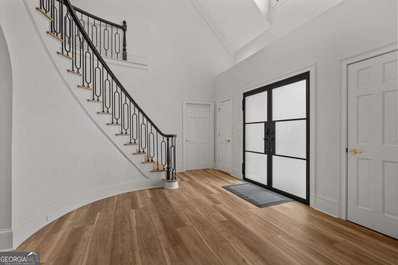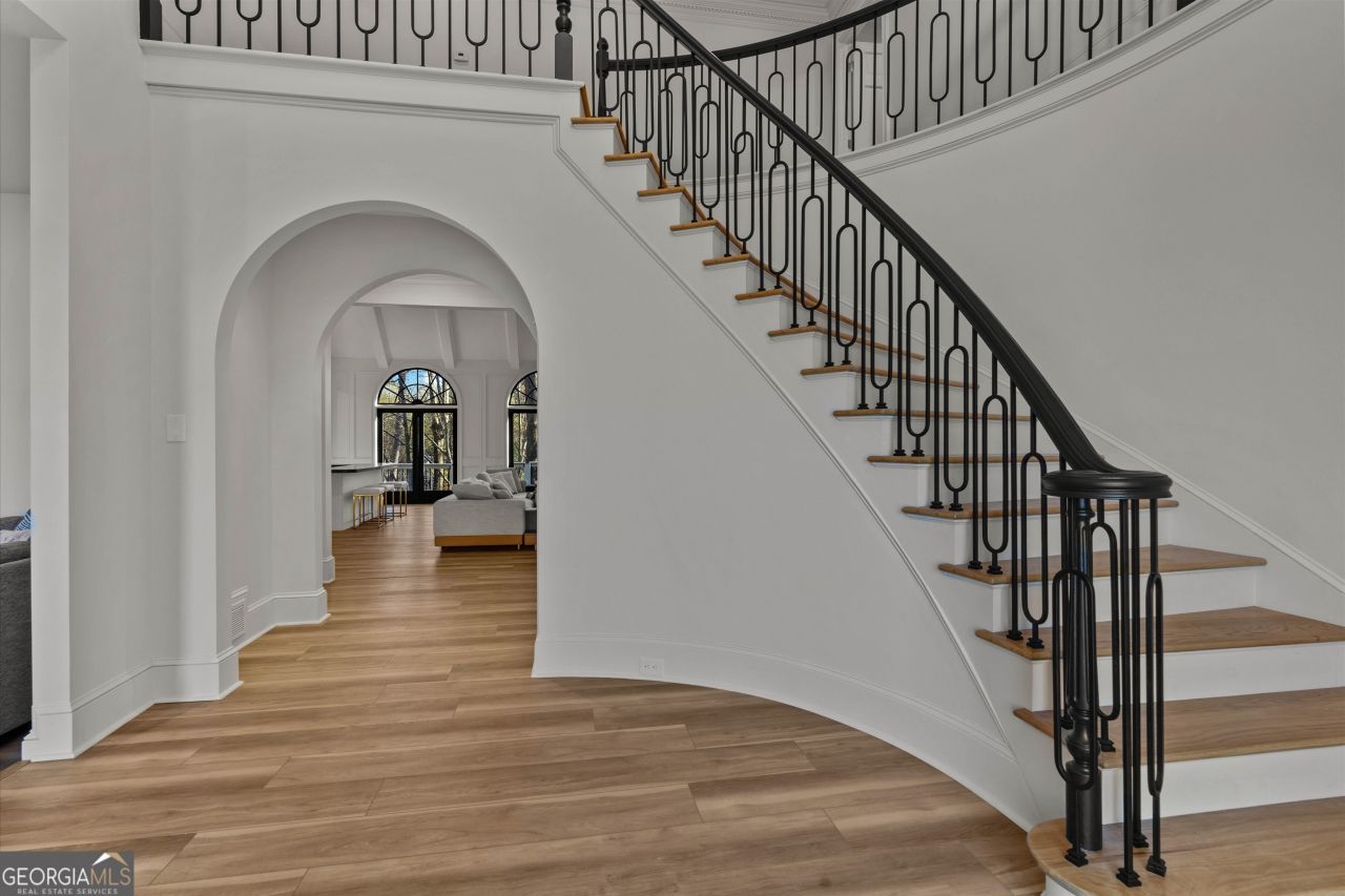 Set within the established Prestwick community and directly across from the Atlanta Athletic Club, this fully renovated estate offers a rare combination of privacy, scale, and refined design on a 1.2-acre lot. A long, private driveway leads to the home, creating a quiet, estatestyle approach and setting the property well back from the street. The exterior presents a timeless, European-inspired look that immediately sets the tone. Inside, the home has been completely reimagined with wide-plank flooring, custom millwork, arched openings, and layered lighting throughout. Custom recessed ceiling details and designer fixtures elevate every room, while abundant natural light highlights the home's generous proportions and thoughtful flow. The main level is designed to support both everyday living and effortless entertaining. The great room features soaring ceilings and a striking fireplace, opening seamlessly to the kitchen and dining areas. The kitchen is a true gathering space, anchored by an oversized island, custom cabinetry, premium appliances, and a well-appointed bar area that makes hosting easy and natural. Large windows and doors connect the interior to outdoor patios, creating a smooth transition between indoor and outdoor living. The primary suite on the main level offers a private retreat with a sitting area, direct outdoor access, custom walk-in closets, and a spa-inspired bathroom featuring a soaking tub, oversized glass shower, and carefully selected lighting that delivers a calm, hotel-like feel. A dedicated office, spacious laundry room, and additional bedroom with a private bath complete the main level, offering flexibility for guests or extended stays. Upstairs, two generously sized bedrooms each feature walk-in closets and ensuite bathrooms, providing privacy and comfort while remaining connected to the main living spaces below. The finished terrace level significantly expands the home's functionality and is ideal for multigenerational living or long-term guests. This level includes two additional bedrooms, two full bathrooms, a second full kitchen, and a second laundry room, allowing for true independence without sacrificing connection to the main home. Multiple living areas provide space for a media lounge, gym, or recreation room, while walk-out access leads directly to the backyard. A massive storage area on this level offers exceptional utility and includes its own separate garage entry, ideal for storing vehicles, equipment, or seasonal items with ease. Surrounded by mature trees, the outdoor setting offers a peaceful backdrop that feels removed from the city while remaining close to everything. Located right off Medlock Bridge, the home is minutes from Medlock Crossing with Regal Cinema, Whole Foods, Target, Publix, Home Depot, and Panera. The Forum at Peachtree Corners is also nearby, offering Trader Joe's, Barnes and Noble, Firebirds Wood Fired Grill, J. Alexander's, H&W Steakhouse, Cava, and Sprouts. With seven bedrooms, seven full bathrooms, and a half bath across three finished levels, this extensively renovated estate delivers privacy, flexibility, and a level of finish that is increasingly difficult to find in an established community of this caliber. Welcome Home!