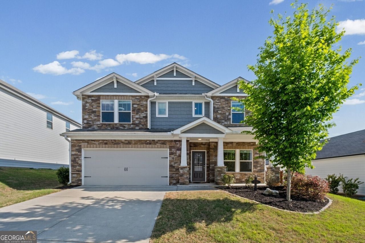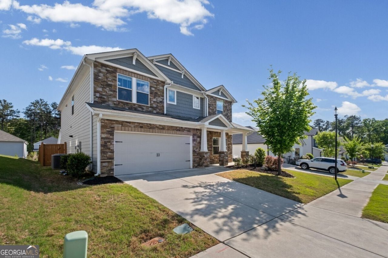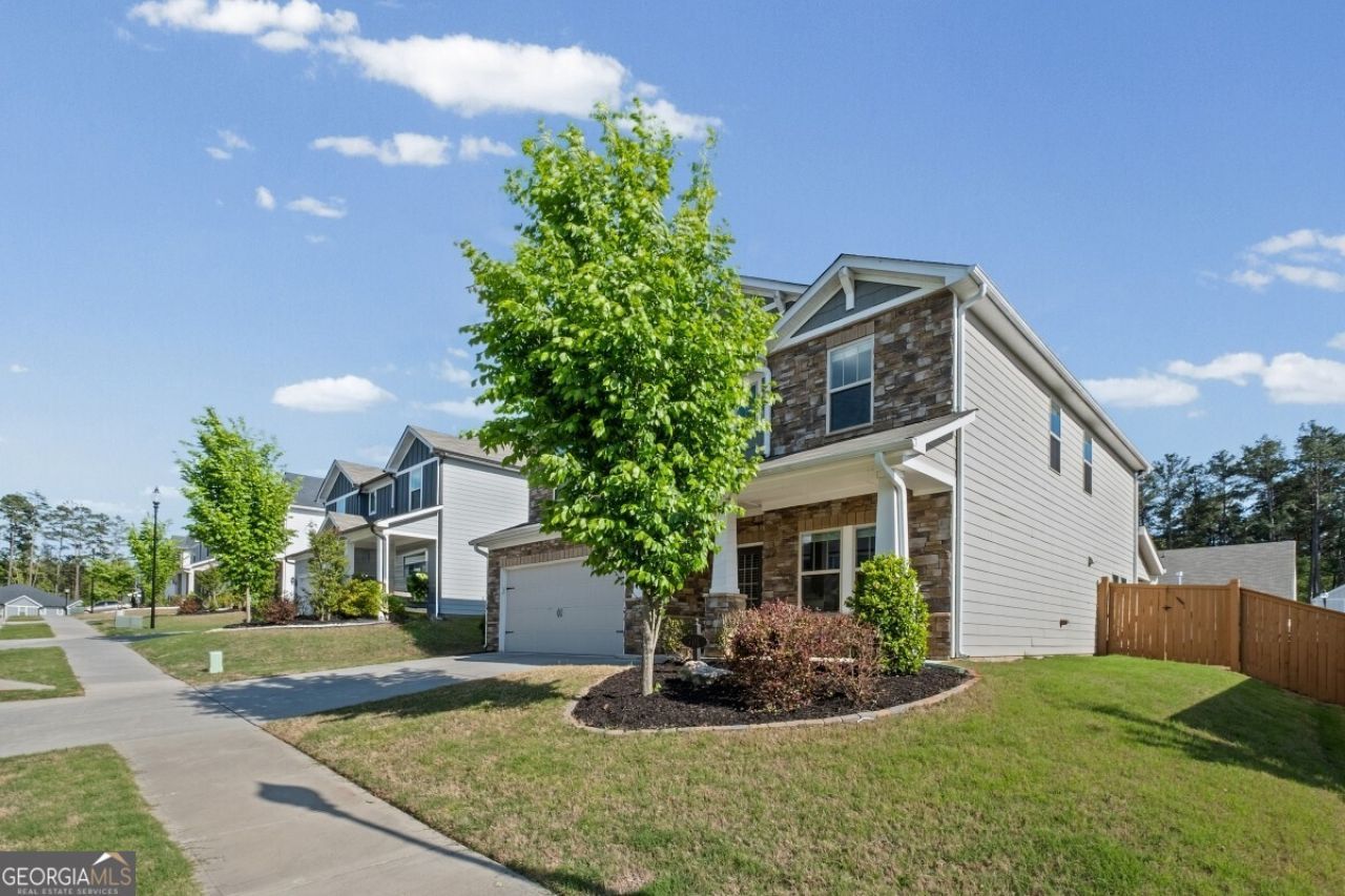 Located in the highly desirable Estates at Riverside, this newer construction home delivers the perfect blend of style, comfort, and modern convenience. From the moment you step inside, you are greeted by an open and airy floor plan filled with natural light and luxury vinyl flooring that extends throughout the main level. The welcoming dining area at the entry flows effortlessly into a stunning designer kitchen featuring an oversized island, custom backsplash, walk-in pantry, stainless steel appliances, and a bright breakfast area with beautiful views of the backyard, creating an ideal space for both everyday living and entertaining. A main-level bedroom adds incredible flexibility for guests, a home office, or multi-generational living. Upstairs, a spacious loft provides endless possibilities as a media room, playroom, or additional lounge space. The expansive primary suite is a true retreat, complete with a generous walk-in closet and a spa-like ensuite bath designed for relaxation. Secondary bedrooms are well sized, offering plenty of space for family or guests, while the upstairs laundry room adds convenience and extra storage right where you need it. Step outside to enjoy a private fenced backyard with a covered patio, perfect for relaxing evenings or weekend gatherings. All of this is ideally located just minutes from I-575, top-rated schools, downtown Woodstock, The Outlet Shops of Atlanta, and an abundance of shopping and dining options.