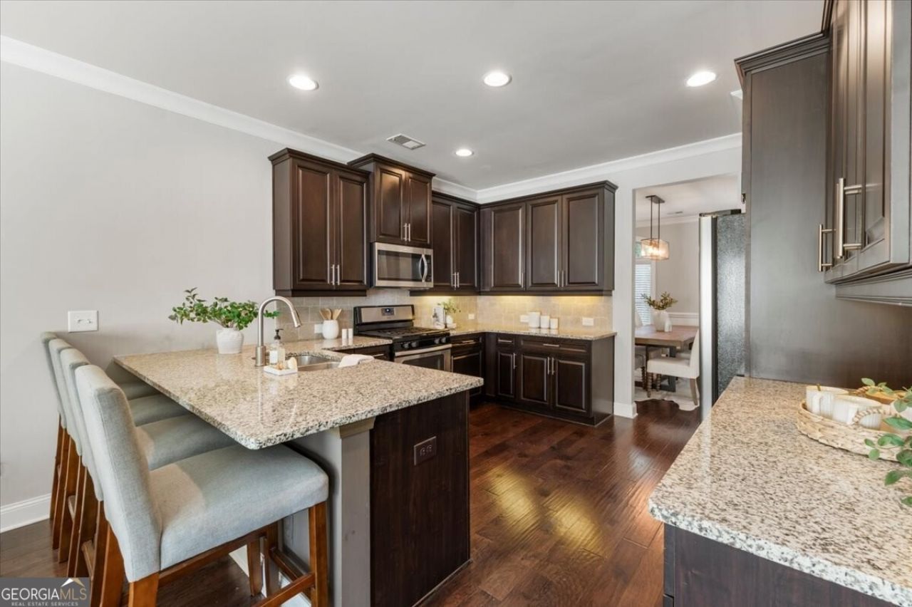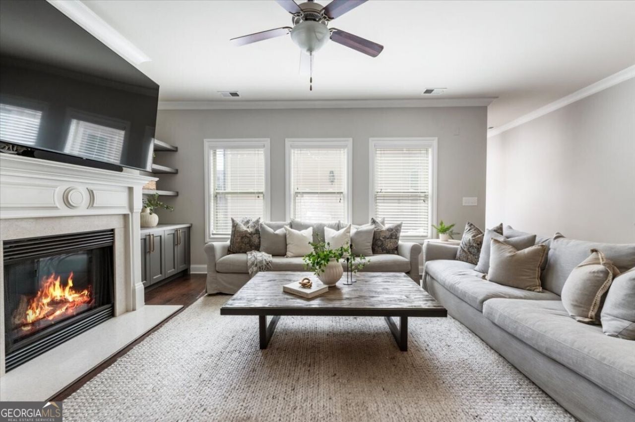 Light floods every corner of this beautifully maintained end-unit townhome in the gated Jamestown community. A professionally landscaped front yard and the private, individual entrance with a covered portico set a welcoming tone from the moment you arrive. Inside, windows on three sides create an airy, open ambiance and hardwood floors flow throughout the main level. Fresh paint and new light fixtures give the space a crisp, move-in-ready feel. A dedicated dining room off the entry is equally suited for everyday enjoyment as it is for more formal entertaining. The kitchen boasts ample storage and an eat-in breakfast bar that doubles as a large island for food prep and serving. The living space is anchored by a fireplace with custom built-ins on either side. Step outside from the main level living space to a private fenced courtyard-perfect for morning coffee, al fresco dining, or letting pets roam making indoor-outdoor living effortless. Upstairs, the primary suite features a tray ceiling, generous walk-in closet, and an ensuite bath with double vanities, a soaking tub, and a tiled shower. Secondary bedrooms are equally well-appointed, each with their own walk-in closets. A two-car garage rounds out the package for low-maintenance, lock-and-leave convenience. The gated community of Jamestown also offers amenities including a pool and tennis courts, while the location puts you minutes from top dining and retail at Halcyon and Avalon, with easy highway access and the scenic trails of the Big Creek Greenway just around the corner.