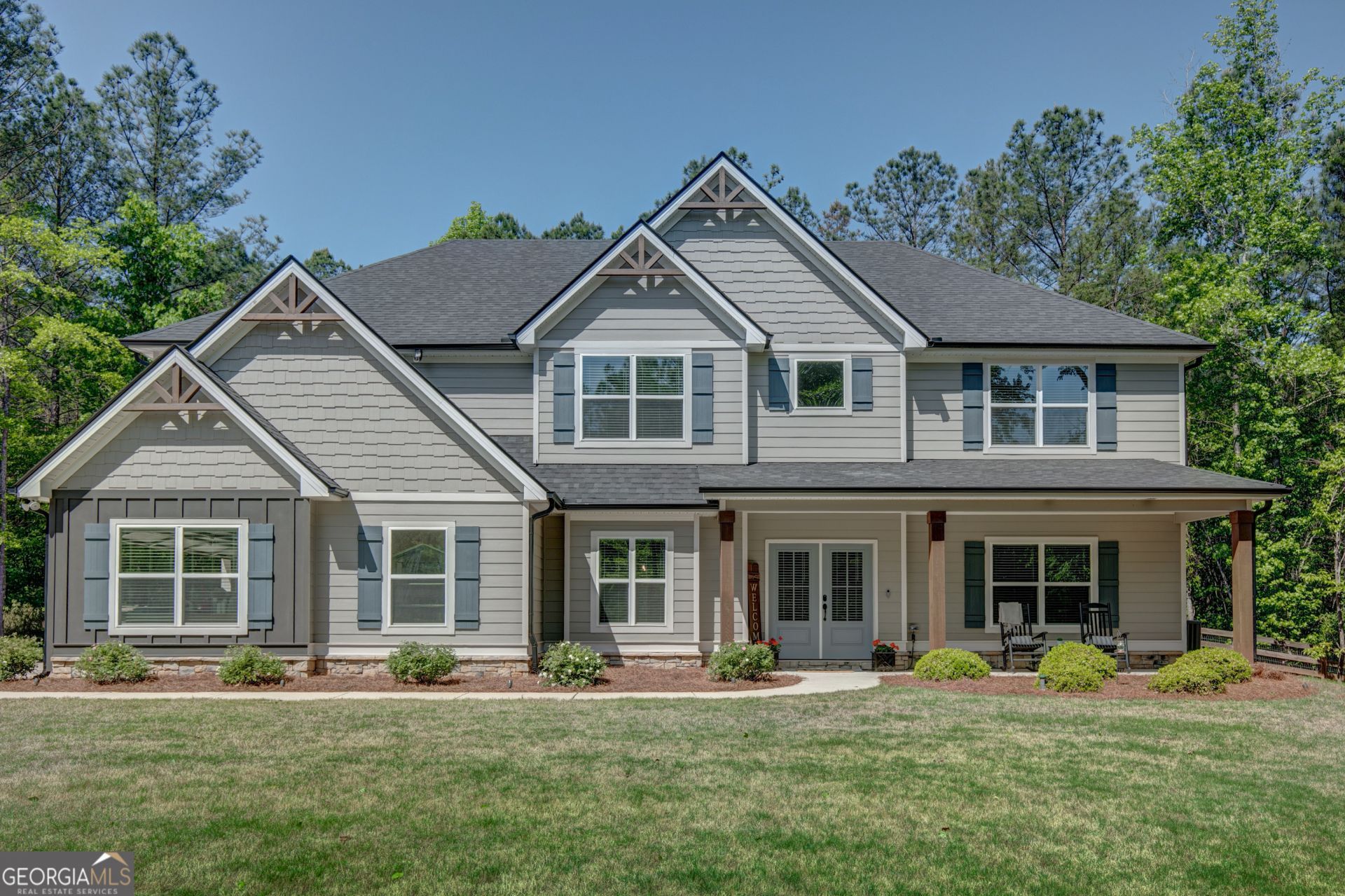 Nestled on 1.6 gorgeous acres among trees for added privacy, this home offers the perfect blend of space and convenience with no HOA and just minutes from beautiful downtown Senoia. A charming rocking chair front porch welcomes you into a stunning two story foyer with an exposed staircase and overlook above. The spacious kitchen with large island is ideal for everyday living and entertaining, while the owner's suite on the main features a private bath with double vanities and a walk in closet. Upstairs you will find four additional bedrooms, two full baths, and a media room. Enjoy added efficiency with spray foam insulation and the peaceful setting this beautiful lot provides. Step outside to an expansive outdoor entertaining area, perfect for hosting gatherings, relaxing evenings, or enjoying the natural surroundings. The property also includes a 12x16 storage building and an 8x12 greenhouse, offering plenty of space for hobbies, gardening, or extra storage.