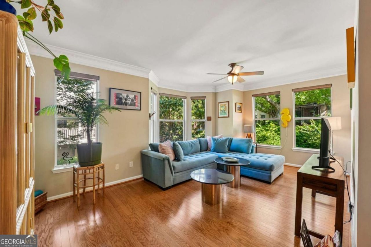 Personality-packed and perfectly located - this 2BR/2.5BA townhome delivers the Intown lifestyle you've been waiting for. With bold green cabinetry, granite counters, hardwood floors, and windows everywhere you look, this one has serious character. The open living and dining areas are bathed in natural light, flowing seamlessly from the living room - with its bay windows and treetop views - through the dining nook and into the kitchen. Cook in style surrounded by stainless appliances and that show-stopping green kitchen that's equal parts functional and fabulous. Upstairs, the primary suite features a tray ceiling, treehouse views, and room to breathe. The second bedroom offers its own curved bay window - perfect for a reading nook, home office, or peaceful retreat. Both bathrooms are well-appointed with granite vanities and tile surrounds. Step outside to your covered wrap-around porch for morning coffee or evening hangs in the canopy. The 2-car garage includes a bonus flex room - gym, workshop, hobby studio, your call. Community perks: gated entry, pool, and fitness center. Steps from Madison Yards, the Beltline, and everything Glenwood Park has to offer.